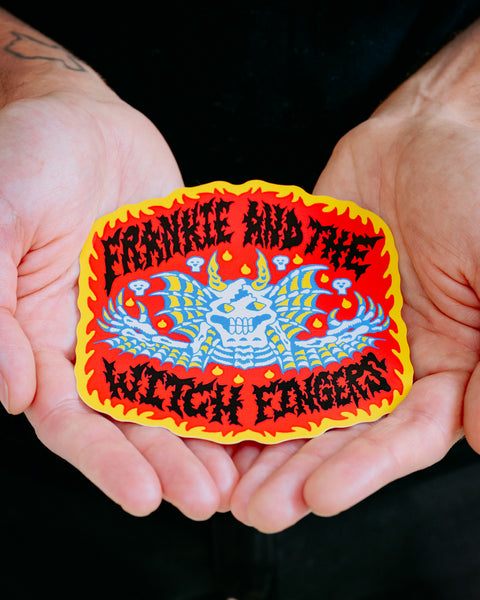 4.5”w x 4.1”h four-color, screenprinted vinyl sticker for Frankie and the Witch Fingers designed by LanceLeee. Stick it on things!